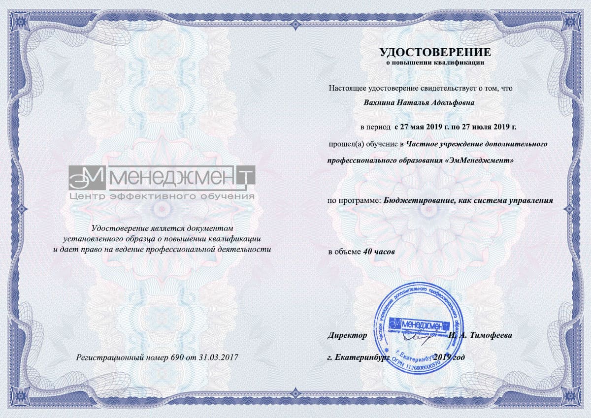 Наш центр эффективного обучения ЭмМенеджмент аккредитован министерством Образования. По окончанию курса управленческого учета и бюджетирования вы получите удостоверение государственного образца о повышении квалификации и переподготовки, подтверждающее соответствие полученных знаний стандартам, принятым в стране. Диплом – хорошее дополнение к списку ваших профессиональных навыков и конкурентное преимущество при трудоустройстве.